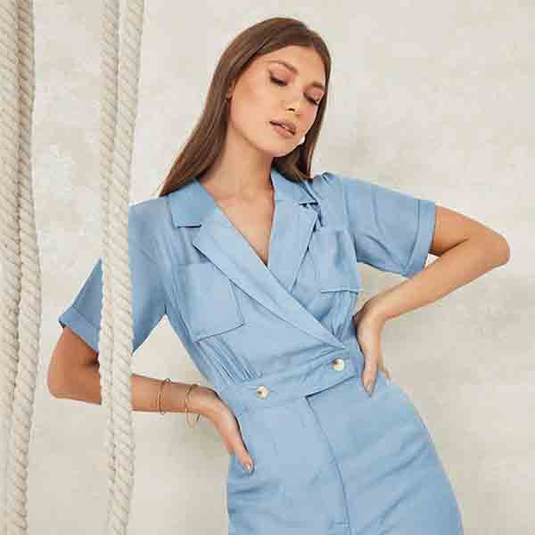 Blue solid basic jumpsuit, has a shirt collar, short sleeves, pockets