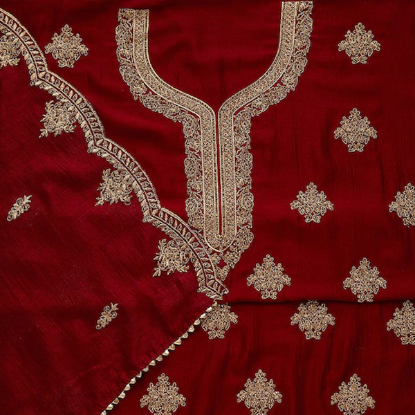 Maroon and gold-toned embroidered unstitched dress material