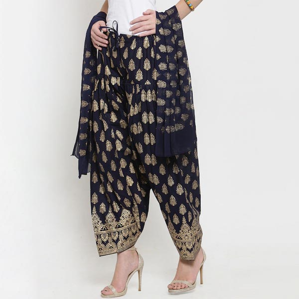 Navy blue and gold-toned printed salwar with gathers and pleats has a waistband with drawstring closure
