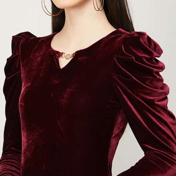 Amp up your style with this bodycon dress, beautifully detailed with a solid tone, 3/4th sleeves, embellished keyhole neckline, and slim fit. Disclaimer: Please check the size guide before you buy. You may need one size bigger than other popular (If you usually fit into Size S of other popular you may need Size M).