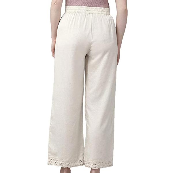 - Offwhite Rayon Flex Solid Wide Leg Palazzo with Lacework in Hem & Side Pocket