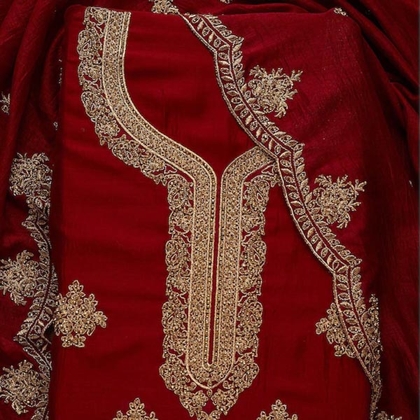 Maroon and gold-toned embroidered unstitched dress material