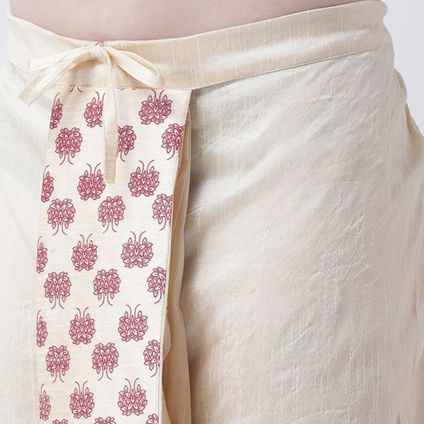 - Cream-coloured and red printed regular-fit dhoti pants with gathered and overlapping detail, has a waistband with a drawstring fastening
