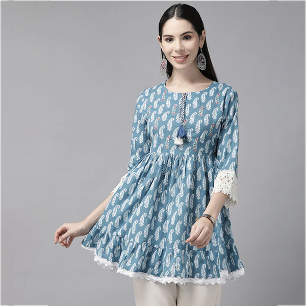 Women Blue & White Paisley Print Tunic with Lace Detail
