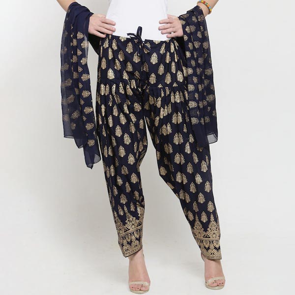 Women Navy Blue & Gold-Toned Block Printed Salwar & Dupatta Set